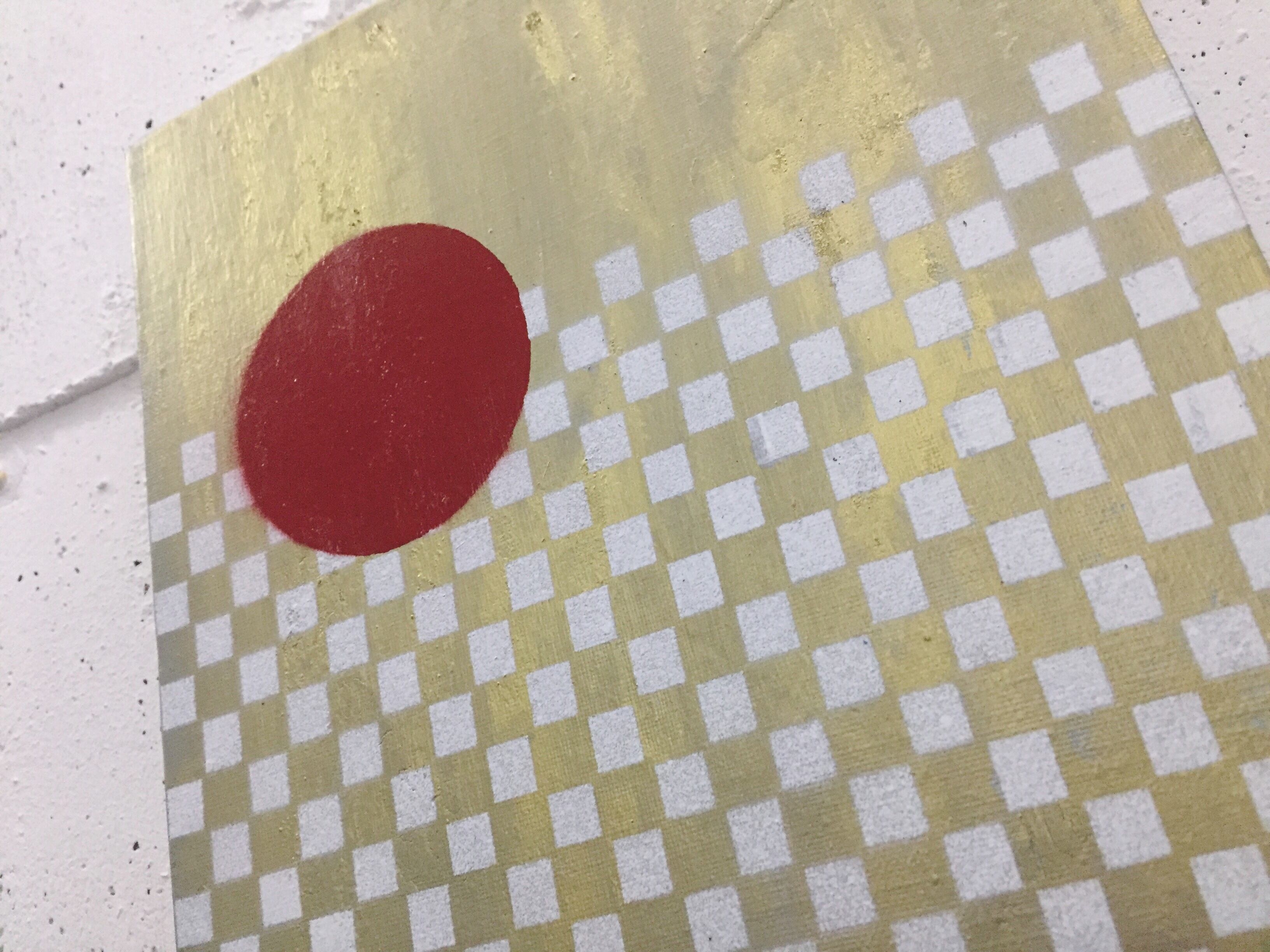 Chu Sho Mon Yo : Red Circle & White Ichimatsu Pattern Stencil on Gold Canvas